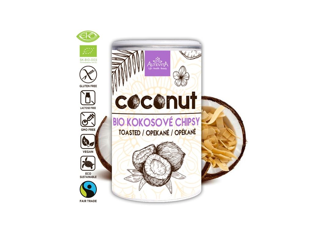 Zloženie: 100% BIO Organic kokosové chipsy opekané (Cocos Nucifera)