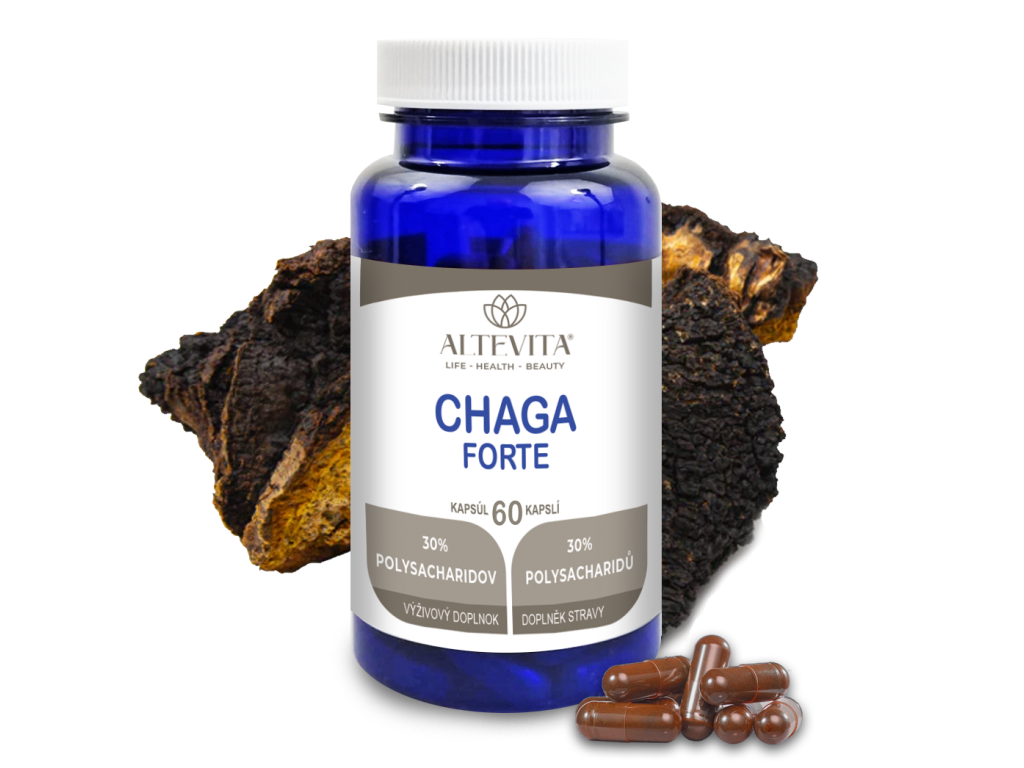 CHAGA FORTE je prémiový výživový doplnok značky ALTEVITA kombinujúci vysoko koncentrovaný extrakt z huby Chaga (Inonotus obliquus) štandardizovaný na 30 % polysacharidov spolu s Vitamínom C v jednej kapsule z rastlinnej celulózy HPMC. Každá denná dávka obsahuje 80 mg Vitamínu C, čo pokrýva 100 % odporúčanej dennej referenčnej hodnoty (RVH).