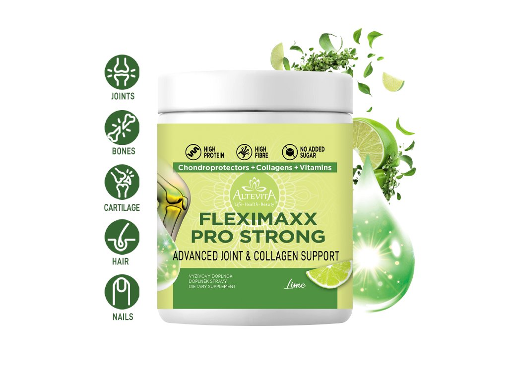 Altevita Fleximaxx Pro strong je komplexná formula, ktorá účinne bojuje proti bolestiam kĺbov, zlepšuje ich pohyblivosť a flexibilitu. Pravidelné užívanie tohto produktu vám pomôže cítiť sa lepšie, zvýšiť vašu aktivitu a kvalitu života. Doprajte svojim kĺbom, väzom a kostiam tú najlepšiu starostlivosť s Altevita Fleximaxx Pro strong!