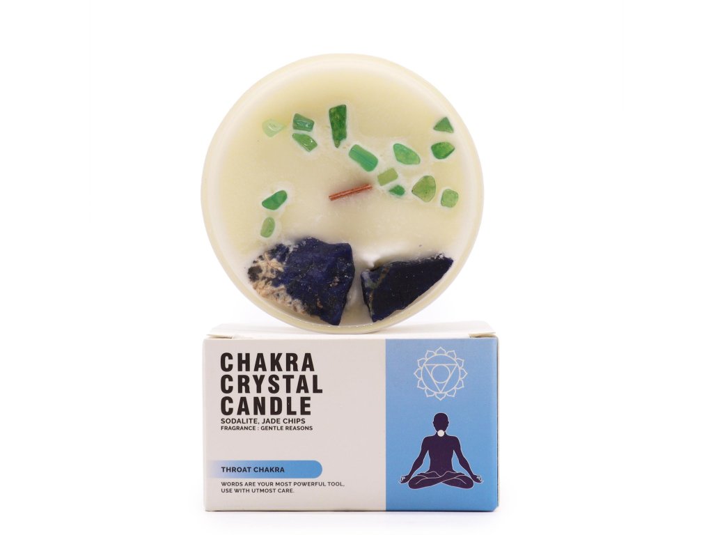 Nájdite svoj hlas a vylepšite komunikáciu s našou krištáľovou sviečkou do krčnej čakry. Táto sviečka, vyrobená z kúskov sodalitu a nefritu, rezonuje s esenciou krčnej čakry. Vôňa "Gentle Reasons" podporuje vedomý a jasný výraz. Na krabičke je pripomenutie: "Slová sú váš najsilnejší nástroj, používajte ich s maximálnou opatrnosťou."