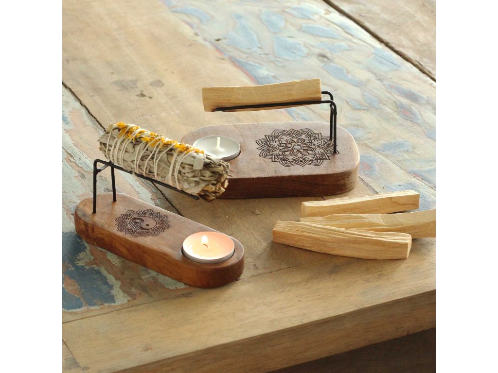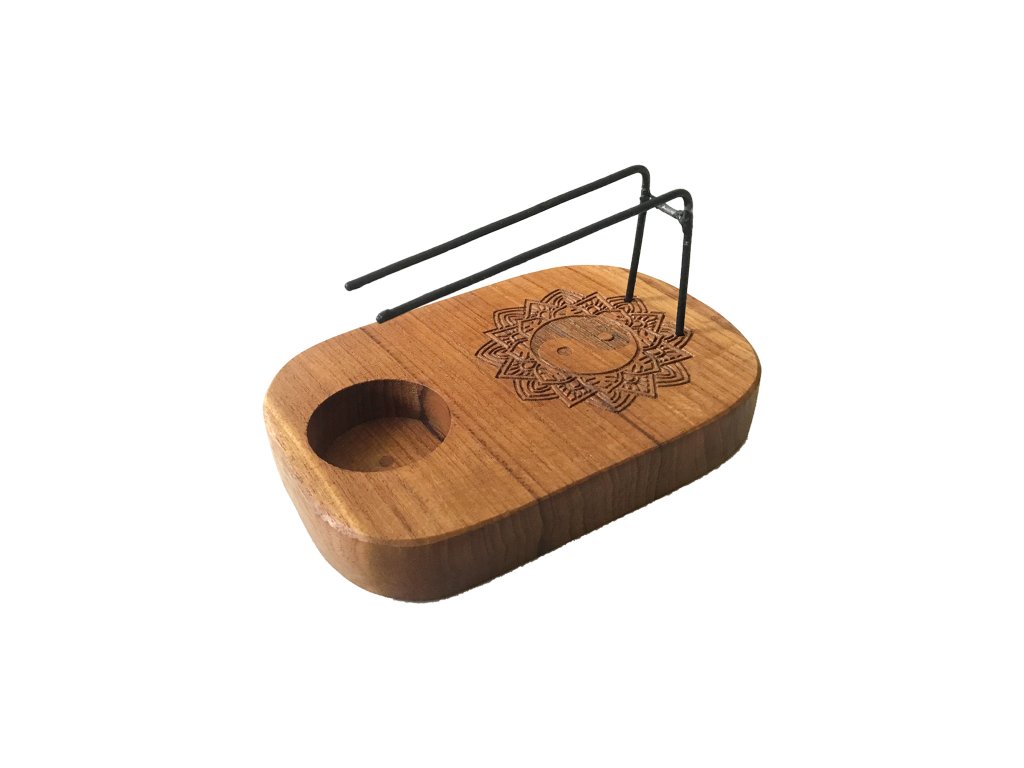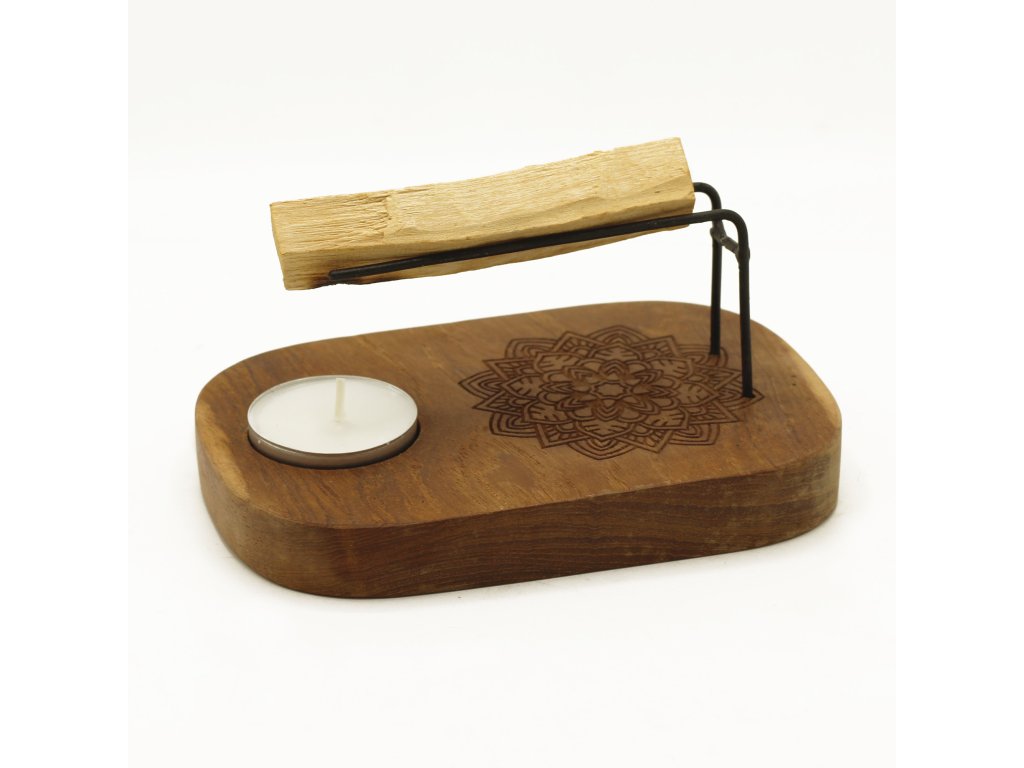 Tieto stojany sú ručne vyrobené v Indonézii z prvotriedneho teakového dreva a majú elegantne jednoduché tvary – obdĺžnikové, štvorcové alebo slza – a sú dostupné v ôsmich rôznych dizajnoch. Každý dizajn dodáva každému prostrediu nádych duchovnej elegancie. Každý stojan je vybavený špeciálnou kovovou vložkou navrhnutou na držanie drievka Palo Santo spolu s jemne vyrezávaným priestorom na čajovú sviečku.