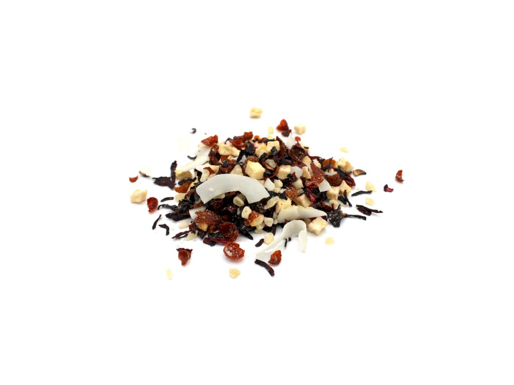 Kúsky ananásu (30 %) [ananás, trstinový cukor, kyselina citrónová, rezané kvety ibišteka, šípky, kúsky jabĺk (9,0 %), soľ , kyselina askorbová , strúhaný kokos (13,0 %), kokosové lupienky (6,0 %), prírodná aróma