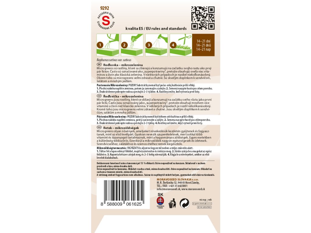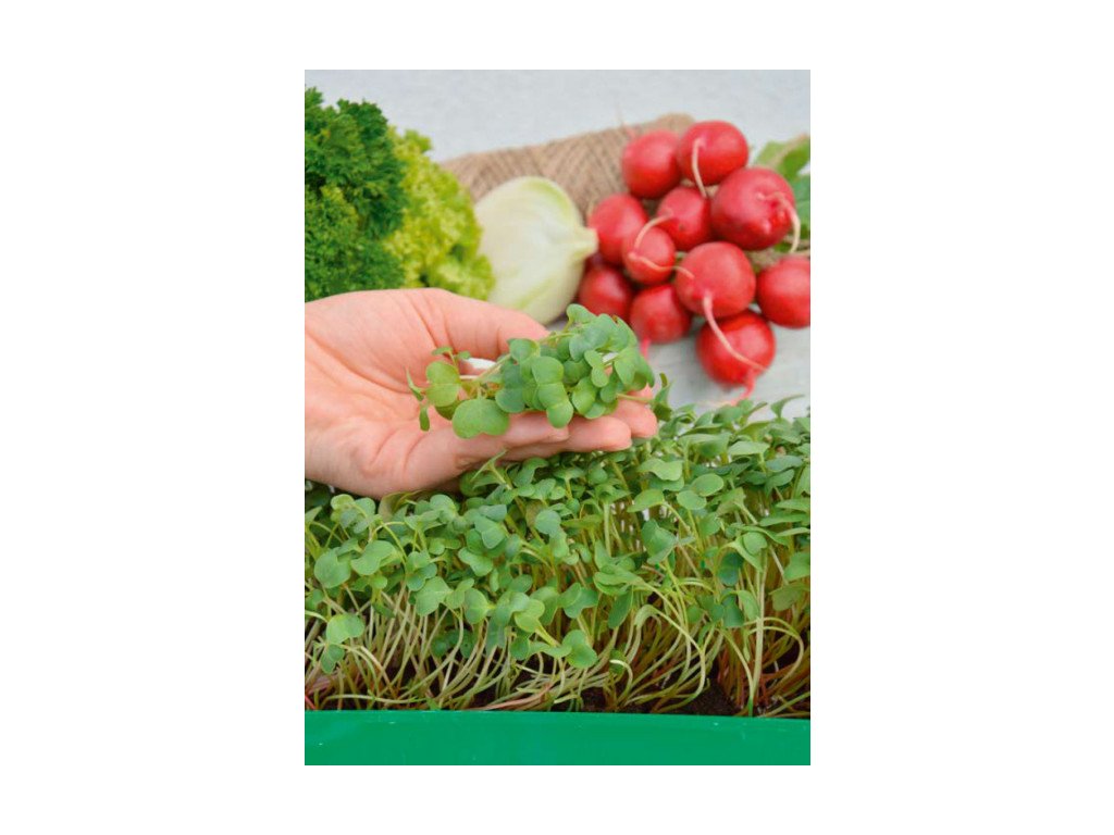 PESTOVANIE MIKROZELENINY: POZOR! Substrát by nemal byť počas celej kultivácie príliš vlhký. 1. Plochú nádobu naplňte zeminou, potom ju zarovnajte a zalejte. 2. Semená nasypte husto po celom povrchu. 3. Dvakrát denne pokropte vodou a pestujte 2-3 týždne. Rastliny zrežte, keď vytvoria prvé listy.