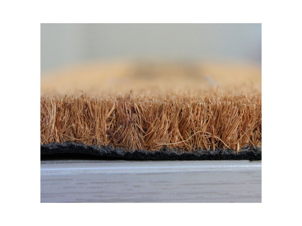 Táto polkruhová kobercová rohožka je zo spodnej strany opatrená protišmykovou gumovou vrstvou. Vrchná strana má odolné kokosové vlákna v hnedej farbe, ktorý veľmi dobre napomáha odstraňovať všetky nečistoty na topánkach.