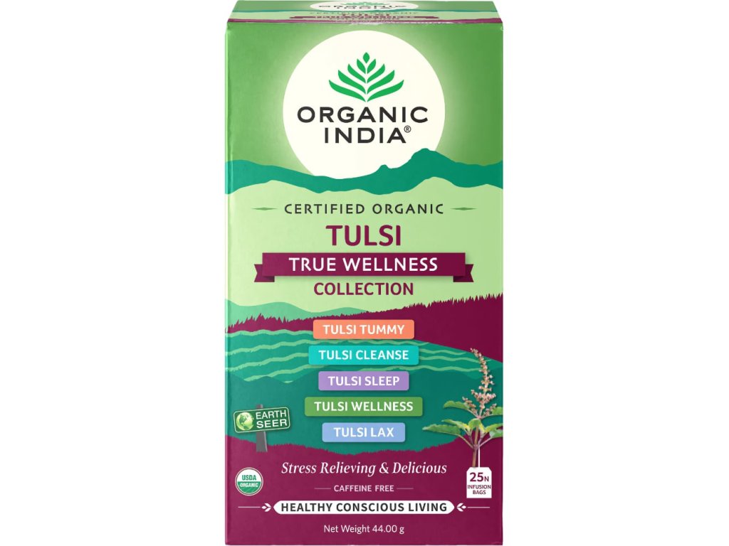 Kolekcia Tulsi True Wellness obsahuje 5 najoblúbenejších bylinných funkčných čajov Tulsi z radu wellness v jednom balení.