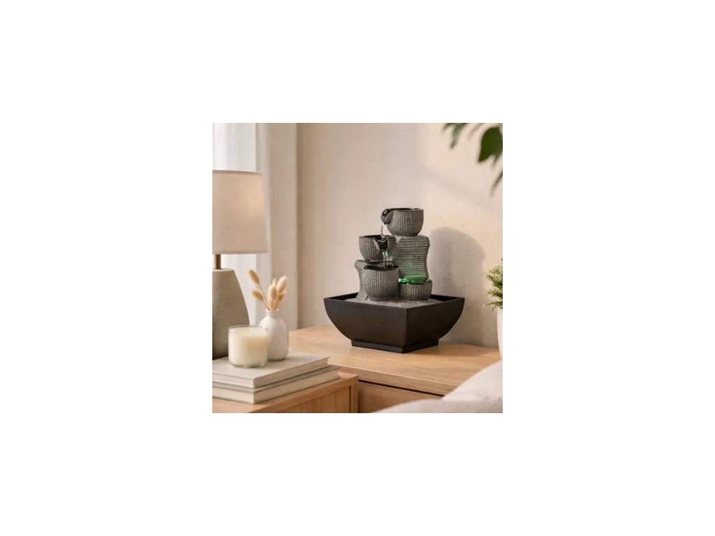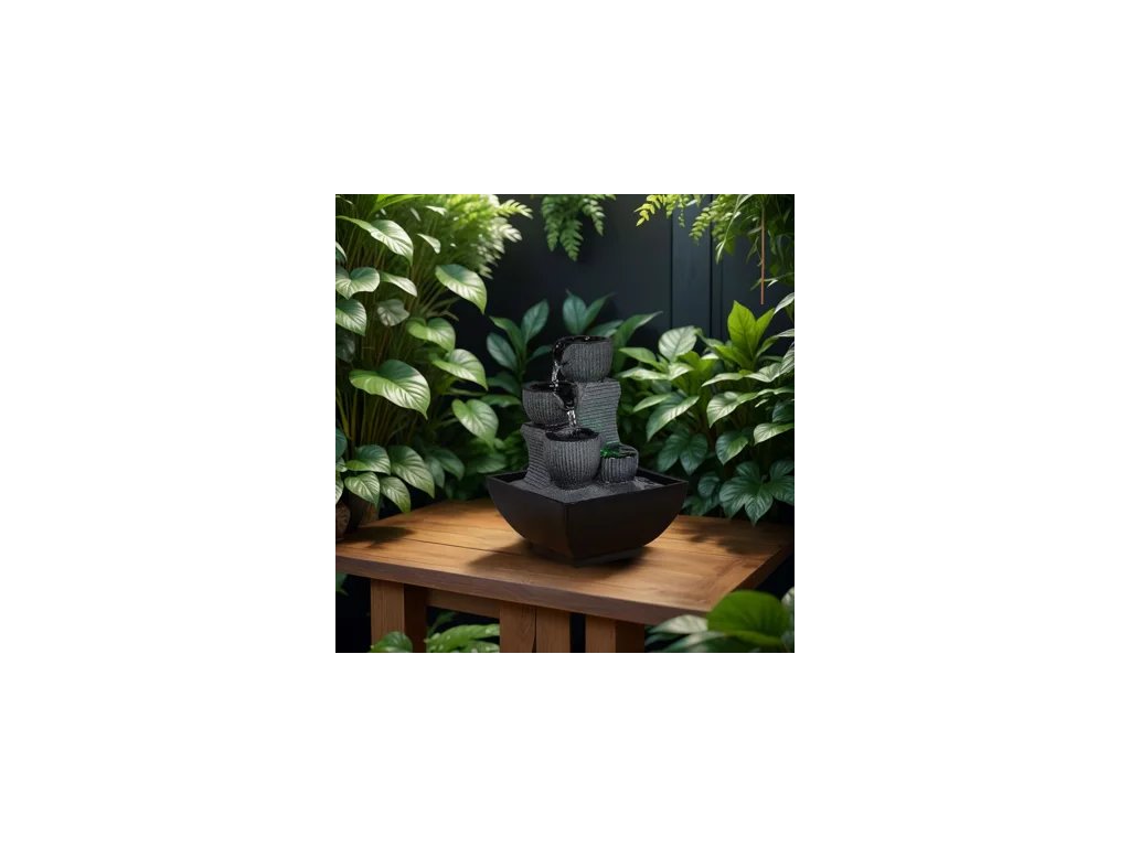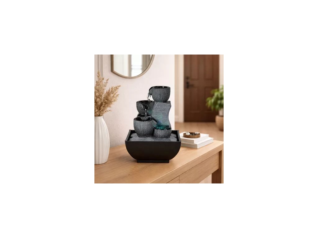 Jej prúdenie na 4 úrovniach s rôznymi nádržami je zvýraznené farebným LED osvetlením. Moderná a pomerne decentná, skutočne inšpiruje k dokonalosti. Na živici a farbe bola vykonaná kvalitná práca, aby jej dodala tento prirodzený a realistický vzhľad.